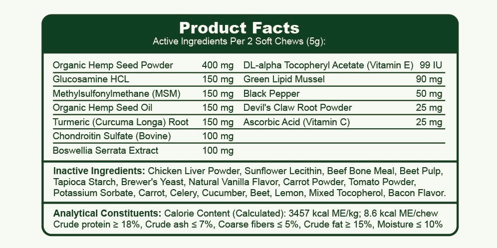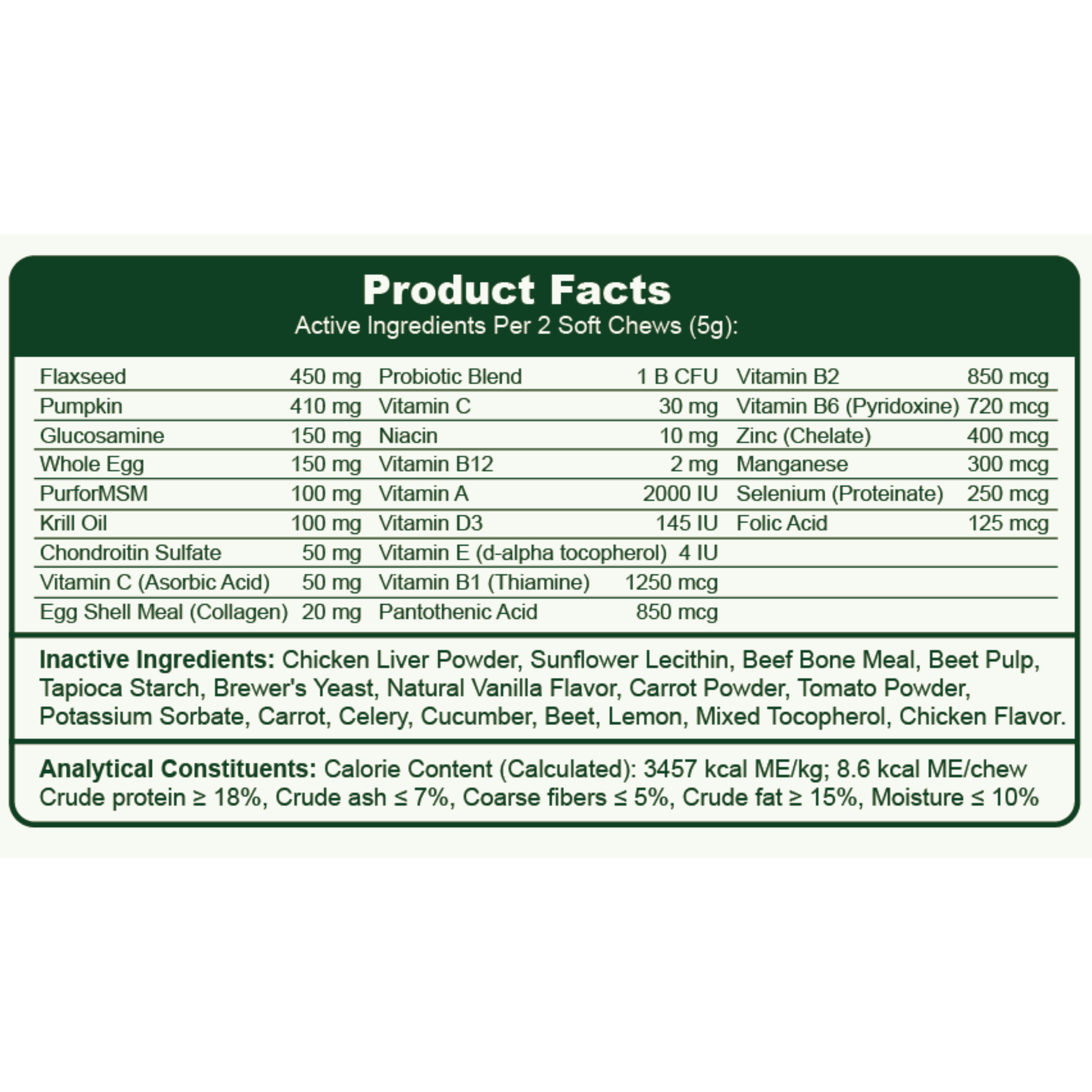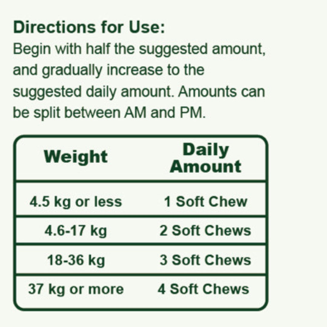 Active Ingredients (Per 2 Soft Chews – 5g)